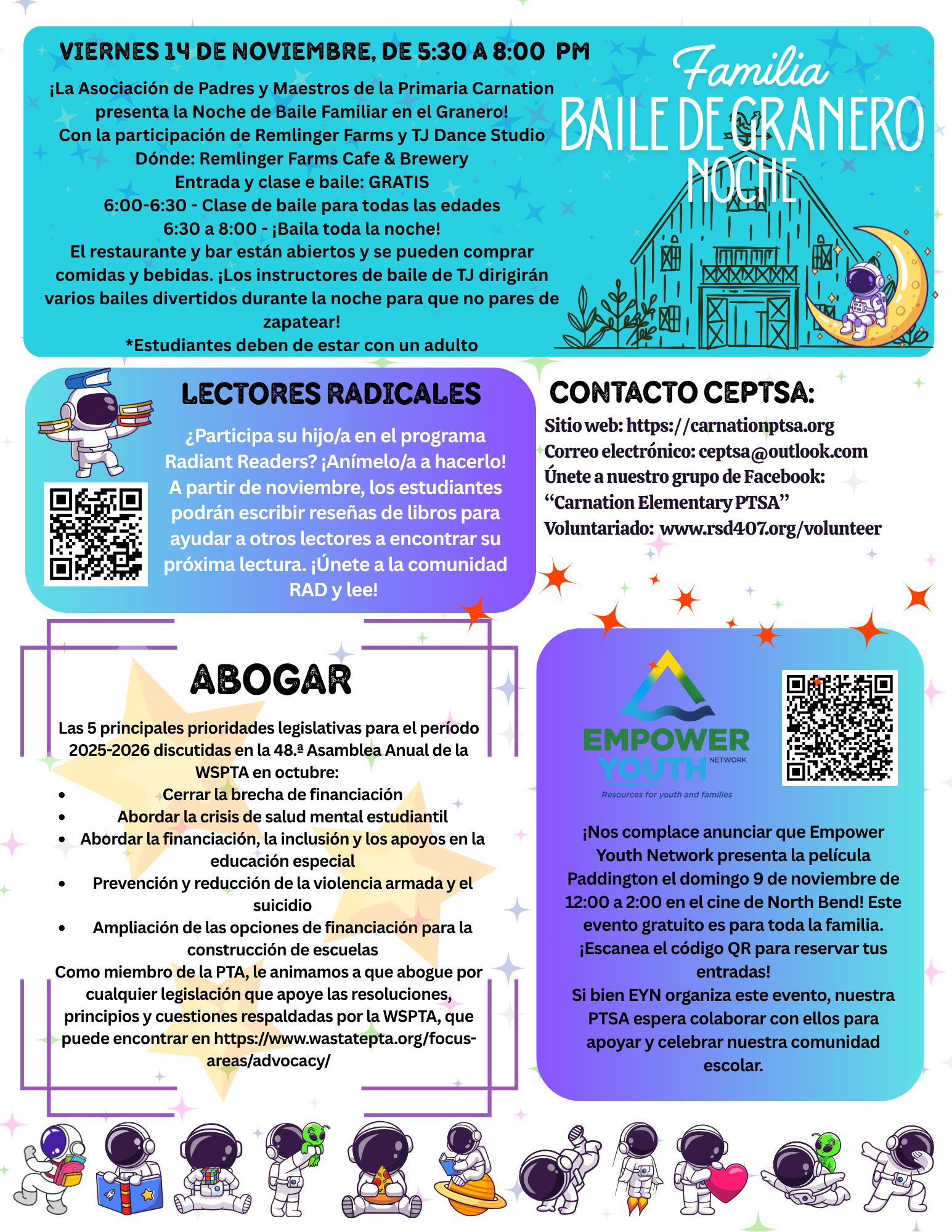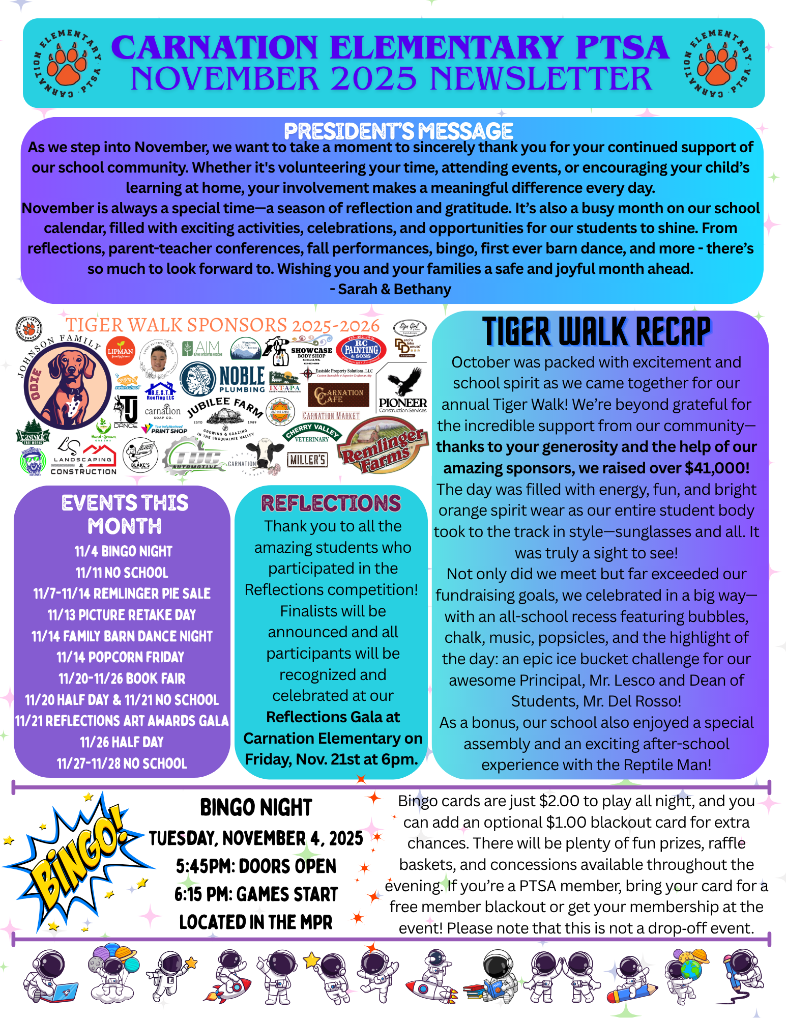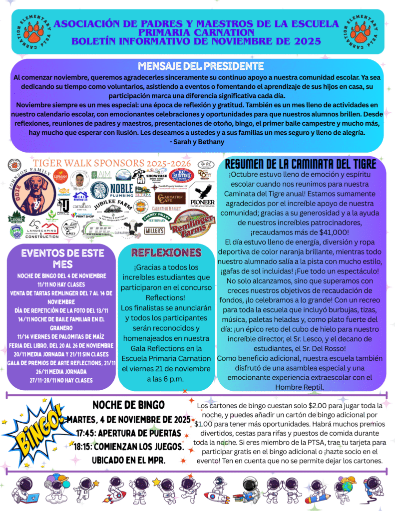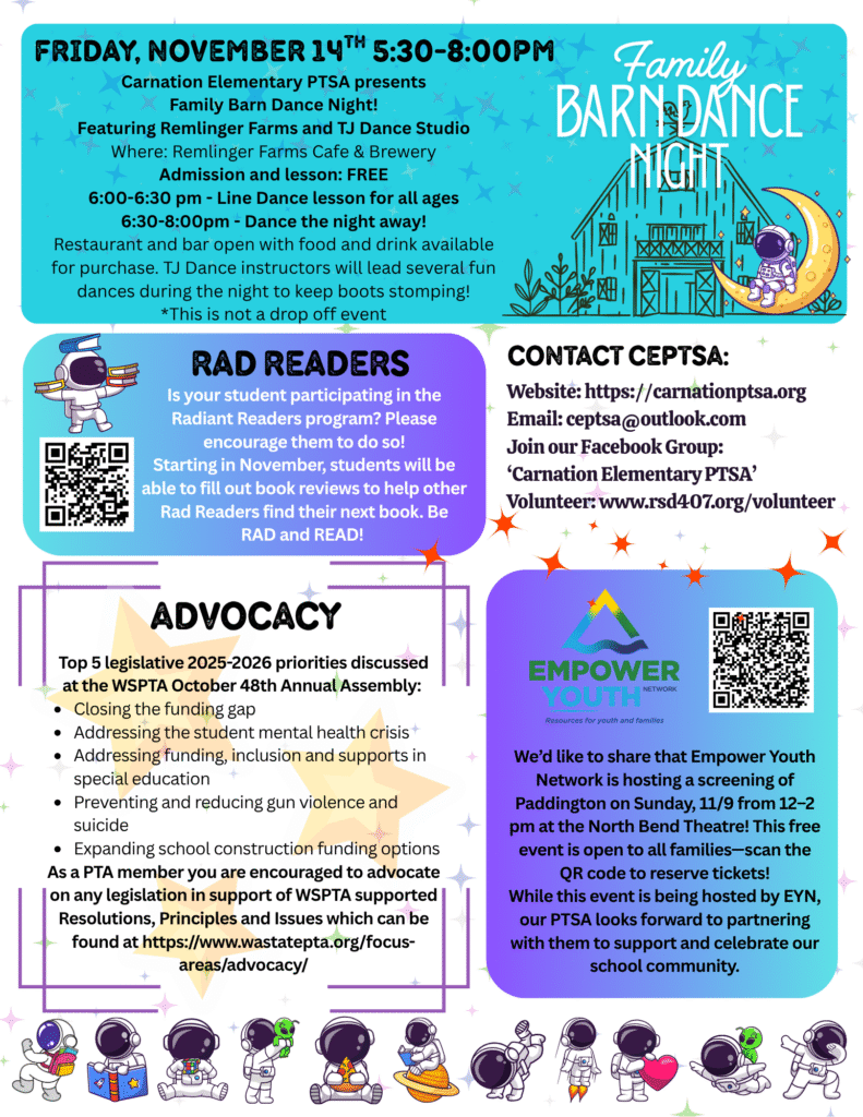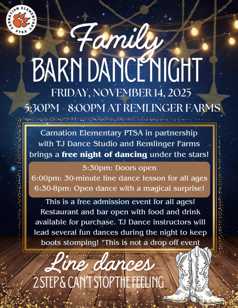 The mission of Carnation Elementary PTSA is to positively impact the lives of all students by partnering with staff, families, and community to foster a culture that values learning, builds community and advocates for all students to excel personally, academically and socially.