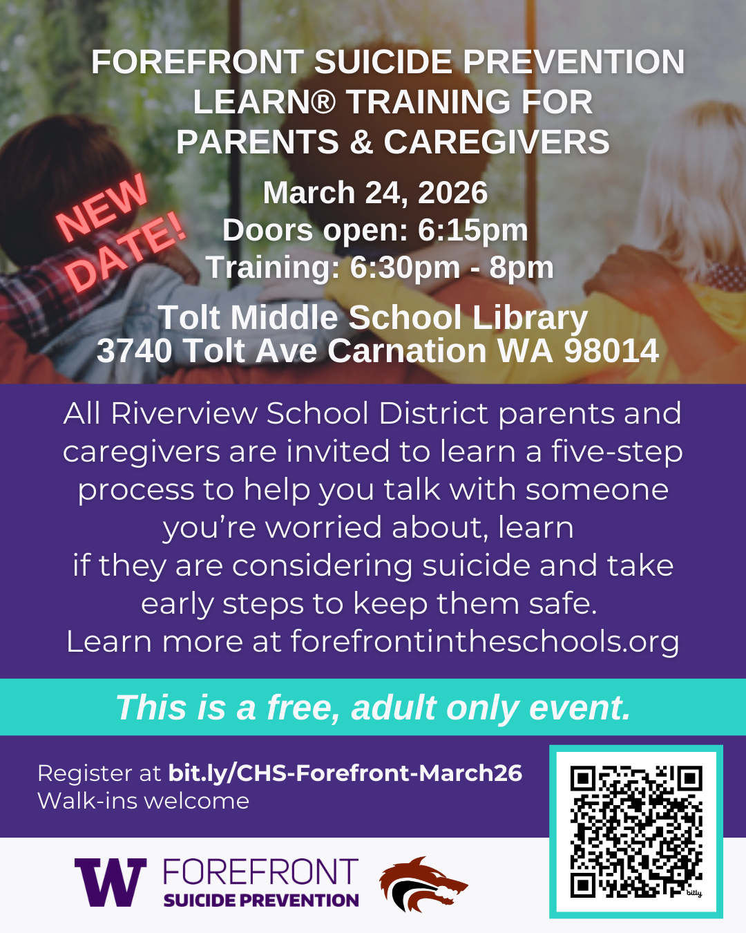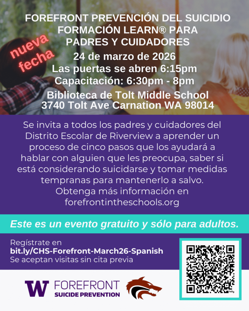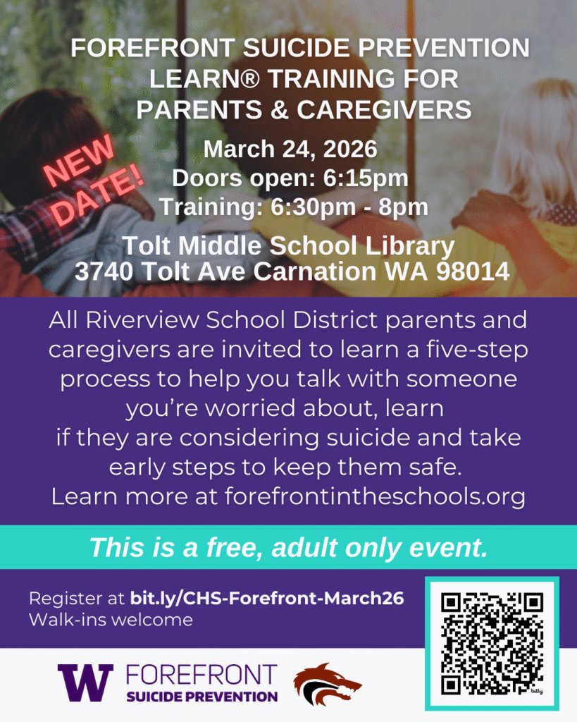 NEW DATE: The Cedarcrest Forefront Team invites Riverview School District parents and caregivers to attend a free suicide prevention training on March 24, 2026 from 6:30pm – 8pm at the Tolt Middle School Library. Come learn a five-step process to help you talk with someone you’re worried about, learn if they are considering suicide and take early steps to keep them safe.