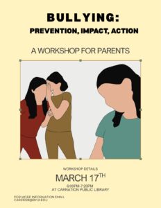 Our student in our community has asked us to help share information about a free parent workshop on bullying prevention being offered locally at the Carnation King County Library.