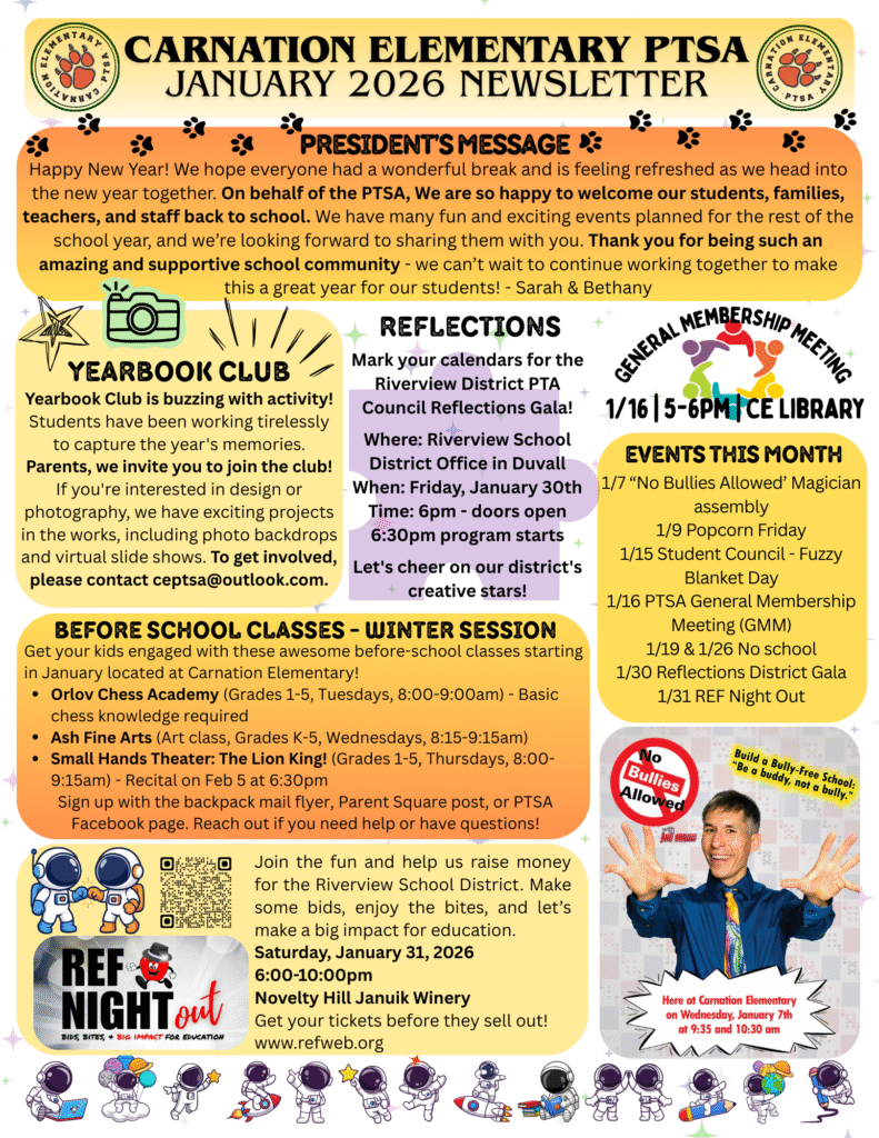The mission of Carnation Elementary PTSA is to positively impact the lives of all students by partnering with staff, families, and community to foster a culture that values learning, builds community and advocates for all students to excel personally, academically and socially.