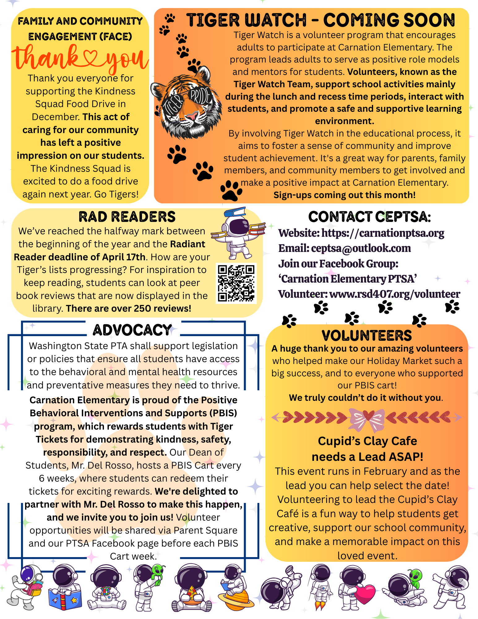 The mission of Carnation Elementary PTSA is to positively impact the lives of all students by partnering with staff, families, and community to foster a culture that values learning, builds community and advocates for all students to excel personally, academically and socially.