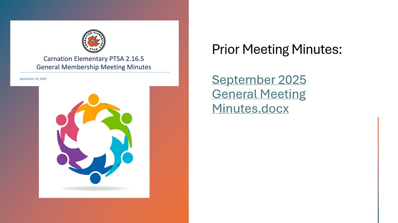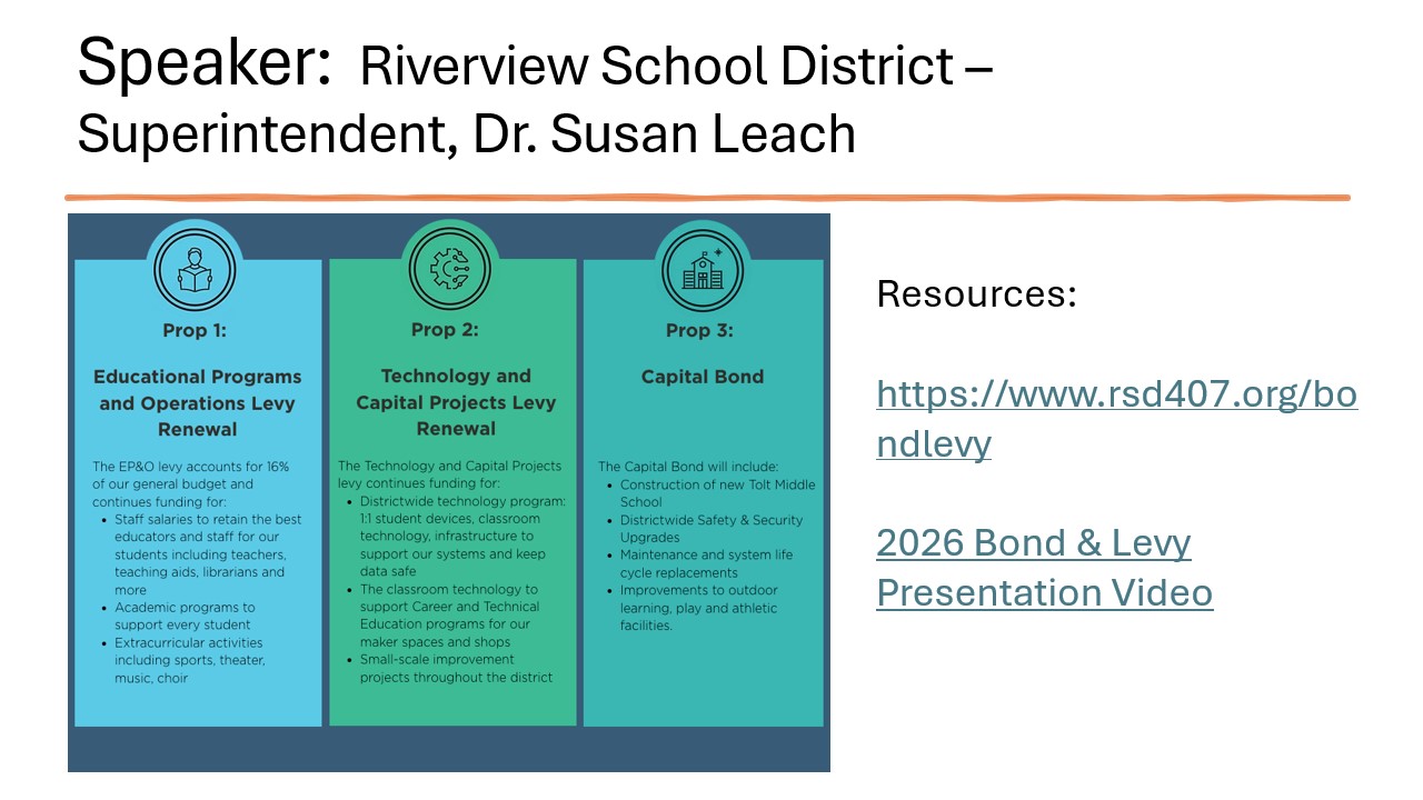 We also heard from Dr. Susan Leach, who provided an overview of the levy and bond initiatives that will appear on the February ballot. The Carnation Elementary PTSA Board would like to share that we endorse these proposals and will be voting YES!