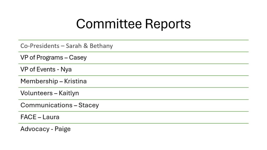 The Nominating Committee for the 2026–2027 board positions were voted on and unanimously approved – please join us in congratulating Krista Willis, Myriah Heuburger, and Kaitlyn Thompson