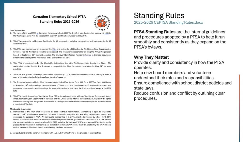 Standing rules were reviewed, voted on, and approved