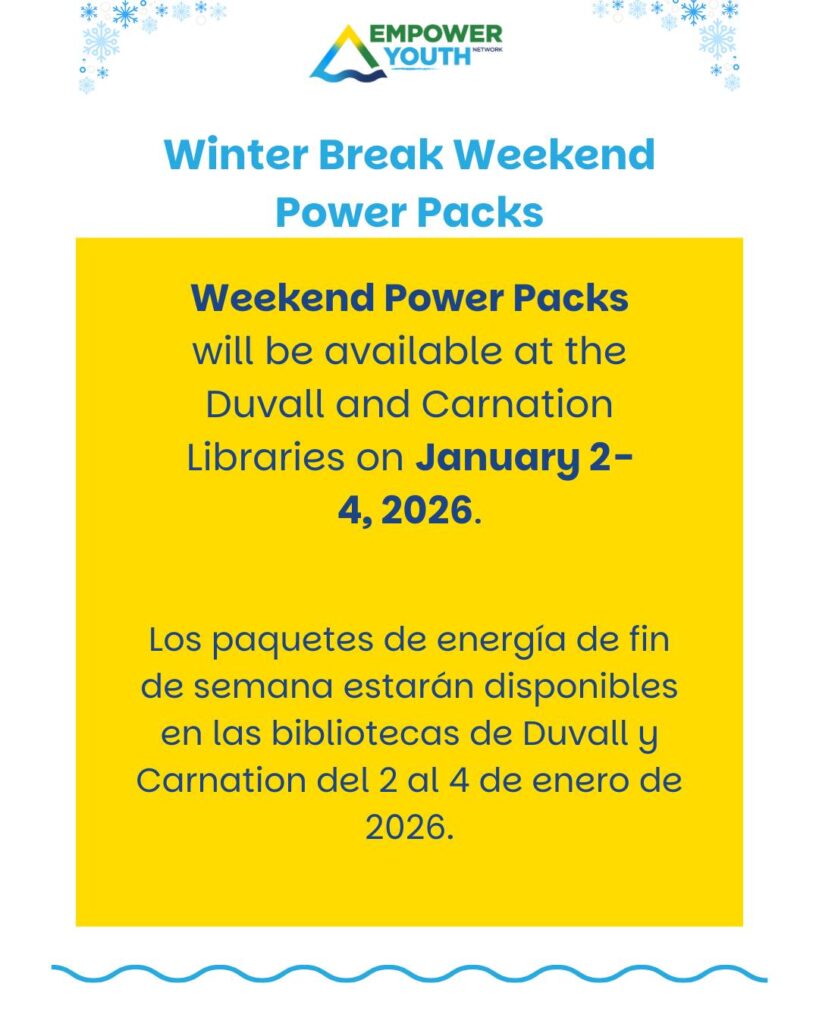 Weekend Power Packs will be available for pick up at both the Carnation Library and the Duvall Library this weekend.