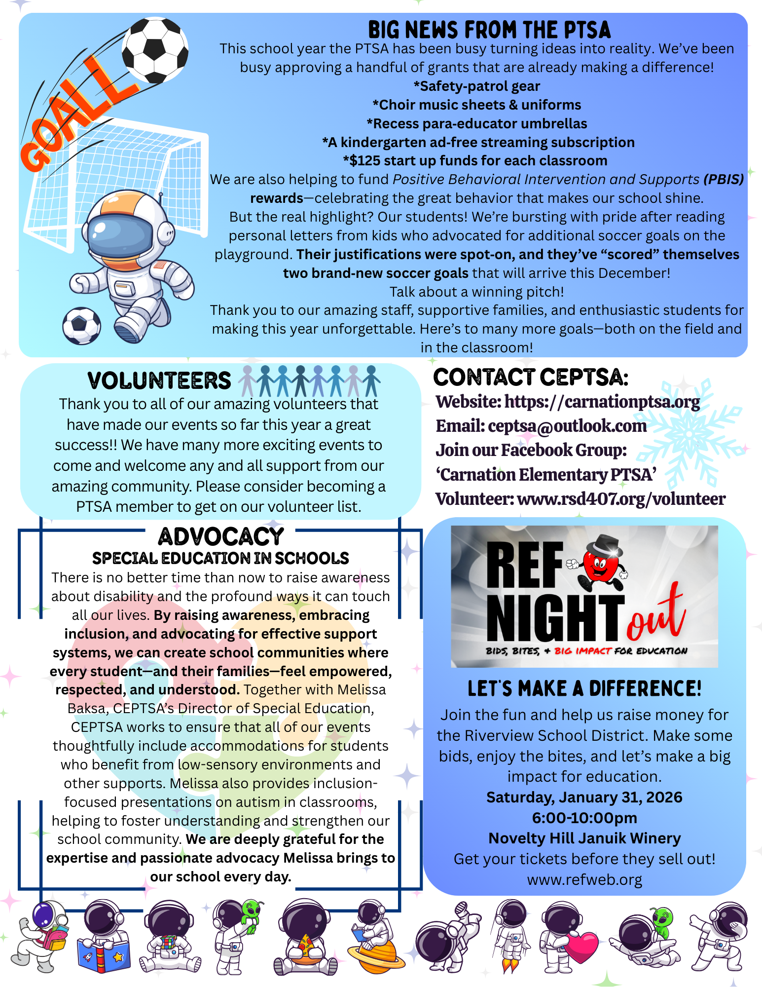 CEPTSA is helping with the PBIS Prize Cart on 12/8-12/12 from 11:15-1:15.