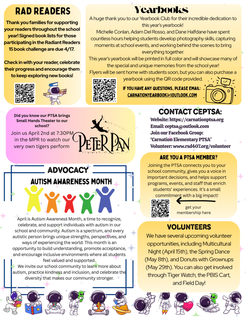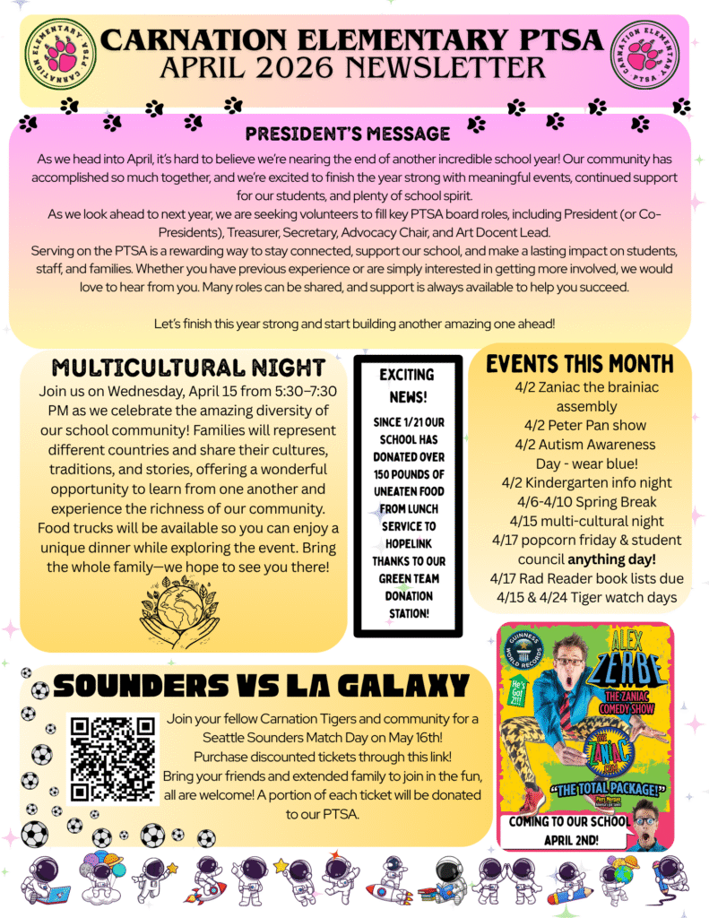 The mission of Carnation Elementary PTSA is to positively impact the lives of all students by partnering with staff, families, and community to foster a culture that values learning, builds community and advocates for all students to excel personally, academically and socially.