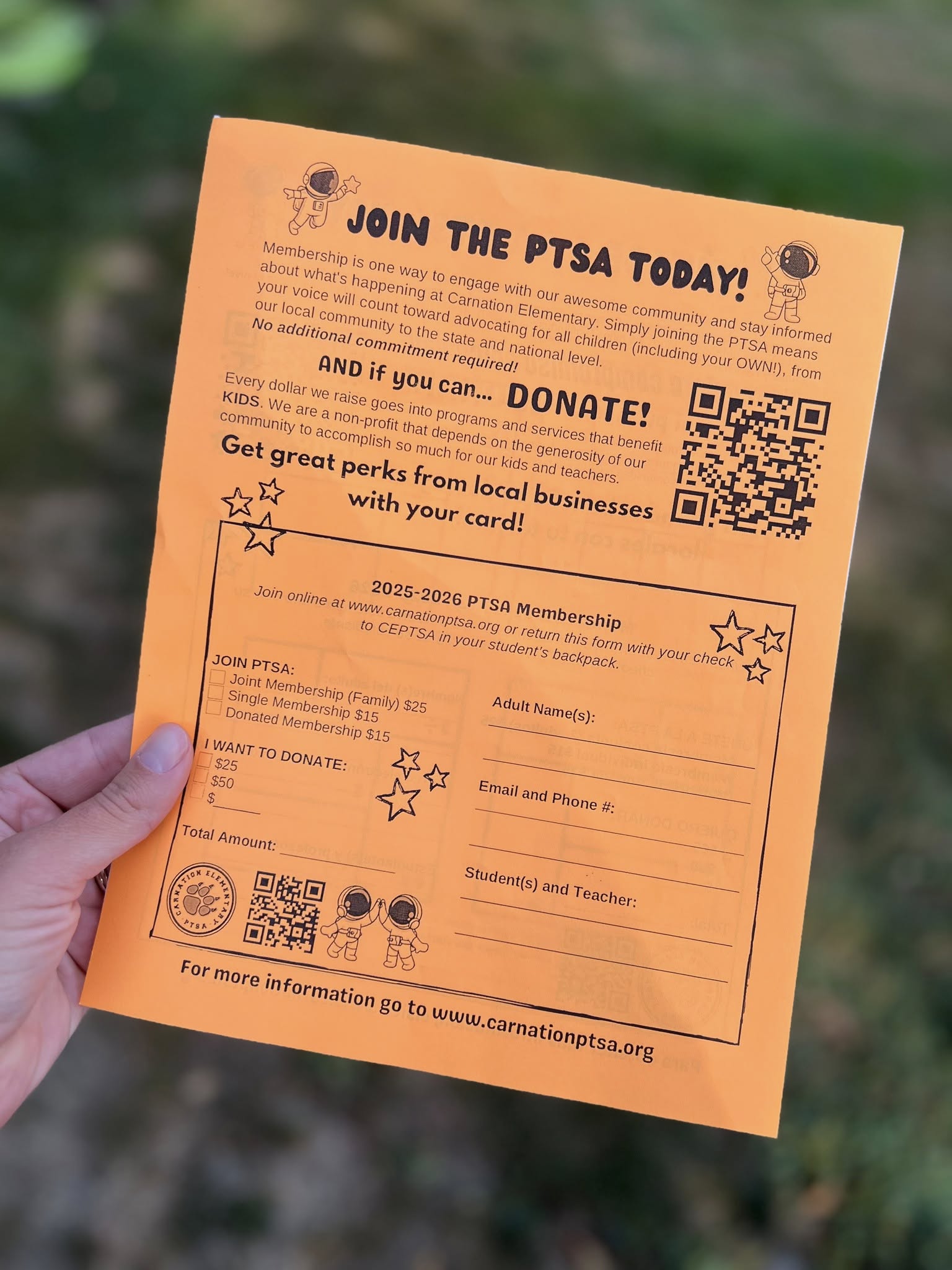 The mission of Carnation Elementary PTSA is to positively impact the lives of all students by partnering with staff, families, and community to foster a culture that values learning, builds community and advocates for all students to excel personally, academically and socially.