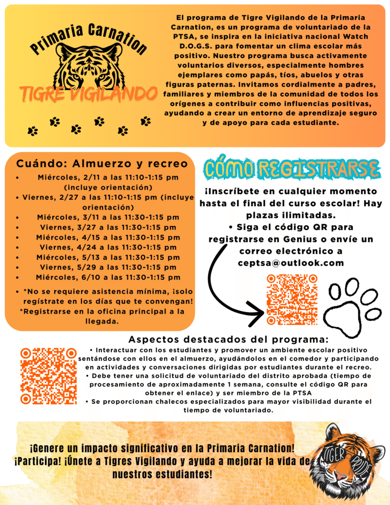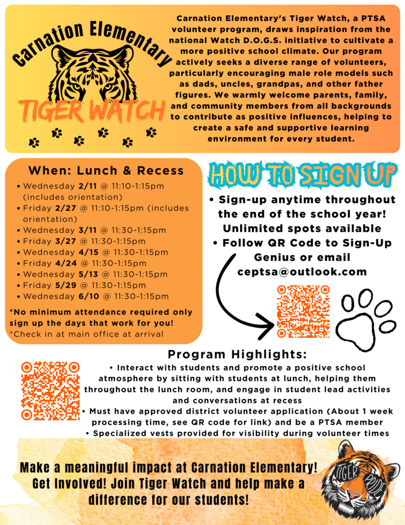Tiger Watch is a PTSA volunteer program inspired by the national Watch D.O.G.S. initiative, working to create a positive and supportive school climate for our students. We love welcoming a diverse group of volunteers – especially male role models like dads, uncles, grandpas, and other father figures – but parents, family members, and community members from all backgrounds are encouraged to join in.